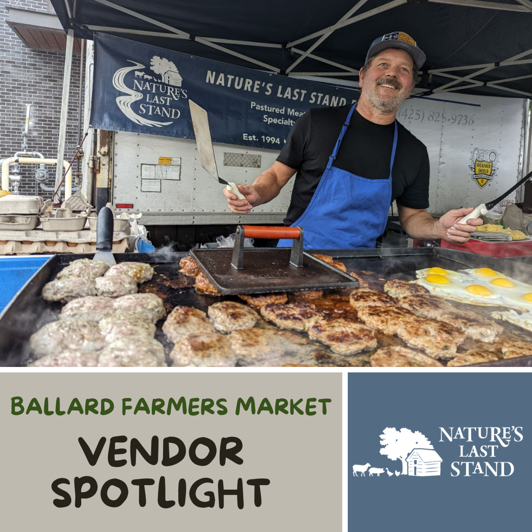 The piece highlights Ballard Farmers Market favorites like Kirsop Farm, Skagit River Ranch, Ayako & Family, R’Sential Candles, Bow Hill Blueberries, and more.